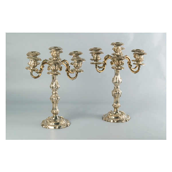 Pareja de candelabros realizados en plata en su color de 900 milésimas y guarnición, de siete luces, con decoración de tornapuntas y roleos.