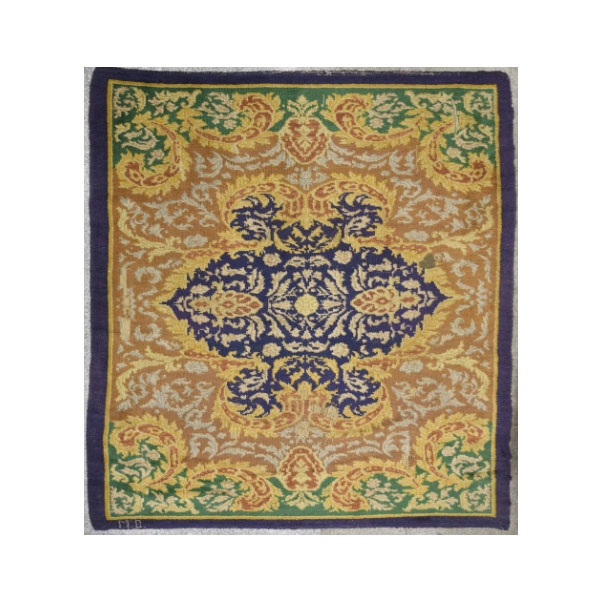 En lana. Campo en beige con rosetón central en color azul realizado con roleos vegetale.