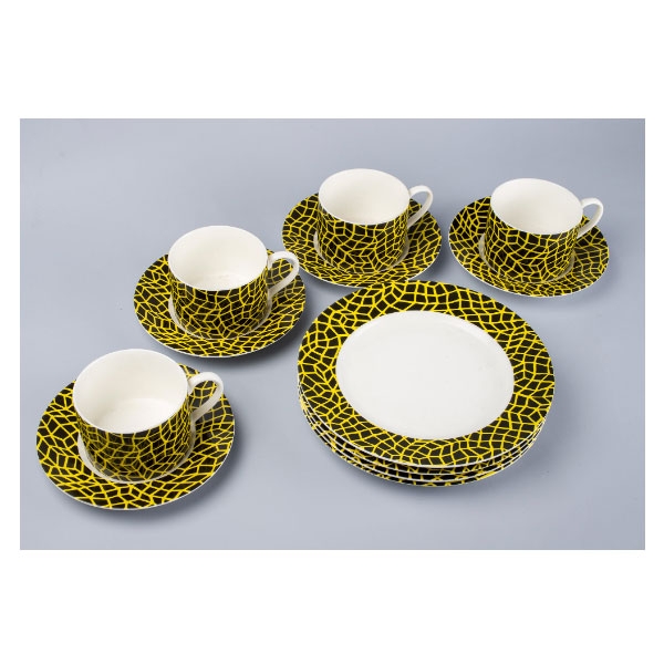 En porcelana, compuesto por 4 tazas con sus platos y sus cuatro paltos de postre.