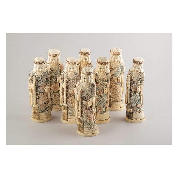 8 Figuras representando ancianas portando una escoba realizadas en marfil, según fotocopia de certificado de antigüedad expedido por Doña Marta Muriel Aguilar.