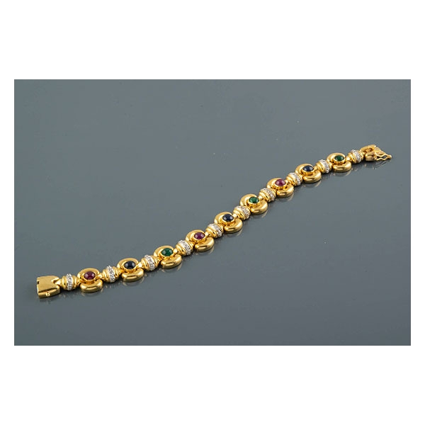 Compuesta por eslabones circulares con zafiros, esmeraldas y rubíes talla cabujón dispuestos de forma alterna y separados por eslabones con banda de diamantes talla brillante, peso total aproximado: 0.50 ct.