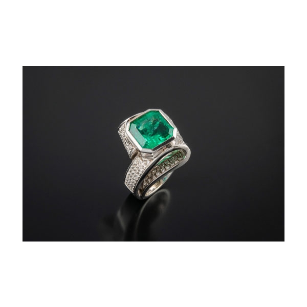 Realizada en oro blanco, compuesta por una esmeralda colombiana natural talla esmeralda cuadrada, peso aproximado: 5.20 ct. según Informe gemológico adjunto de JOSEPH W. TENHAGEN APPRAISALS, INC.