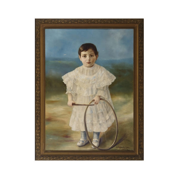 Retrato de niño vestido de blanco con aro.