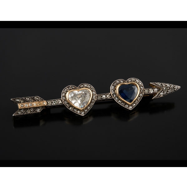 Realizado en oro y plata, en forma de flecha compuesta por diamantes tallas rosa y brillantes antigua, peso total aproximado: 1.87 ct.