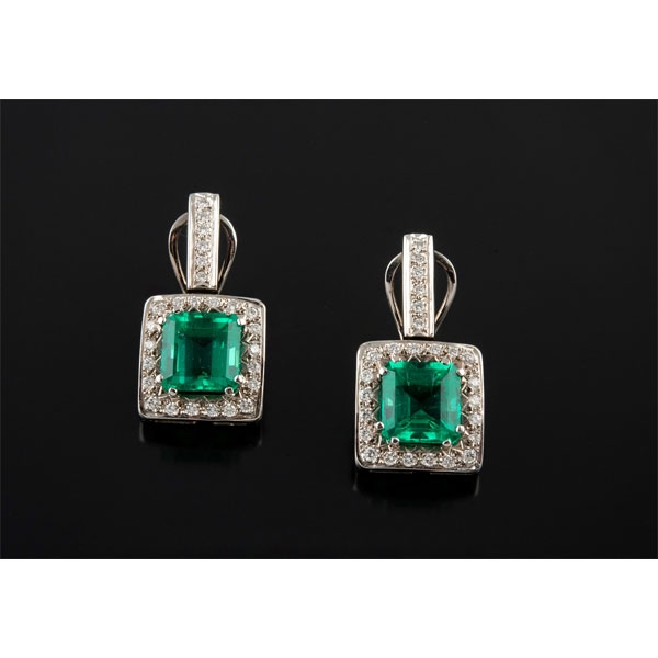 Realizados en oro blanco, con dos esmeraldas centrales talla esmeralda, peso total aproximado: 8.34 ct.