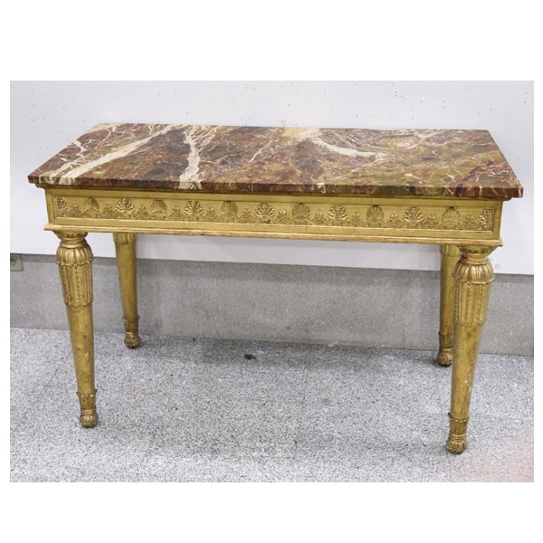Con motivos de veneras y hojas lanceoladas en festón en la cintura y patas con motivos de haces neoclásicos. Tapa en grueso mármol italiano jaspeado. Medidas: 98 x 75 x 150 cm