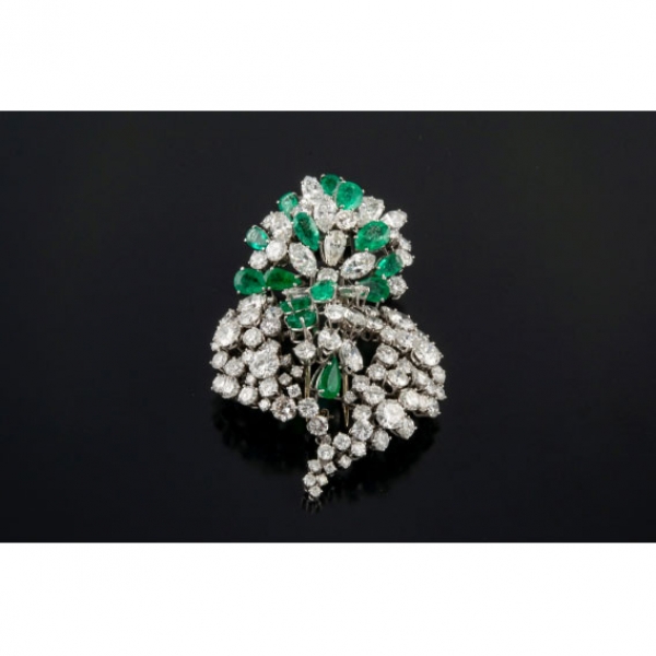 Realizado en oro blanco, representando un ramillete floral, compuesto por diamantes talla brillante, marquisse y perilla montados en garras a diferentes alturas.