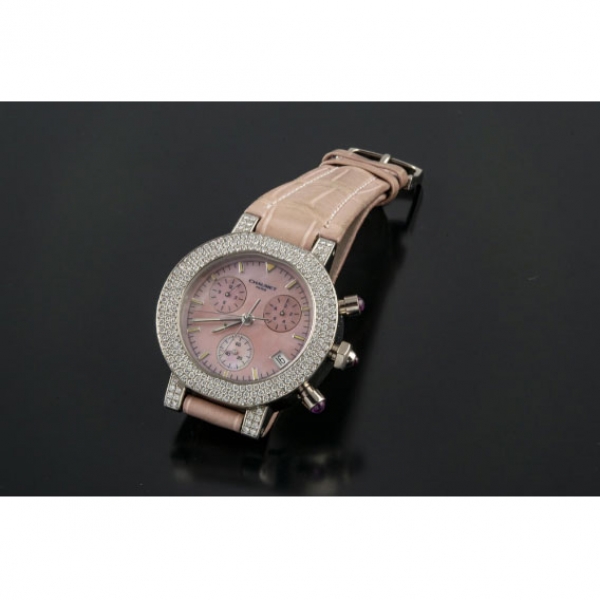 Esfera rosa nacarada, numeración baquetonada, agujas tipo bastón, ventana para calendario a las 4h. y tres esferas contadoras para el crono. Movimiento de cuarzo. Pulsera de piel rosa y hebilla de oro blanco originales. Nº 23e0080