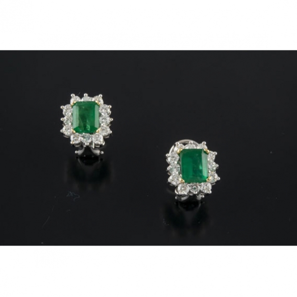 Realizados en oro blanco, con esmeraldas talla esmeralda, peso total aproximado: 4.44 ct. orladas por diamantes talla brillante