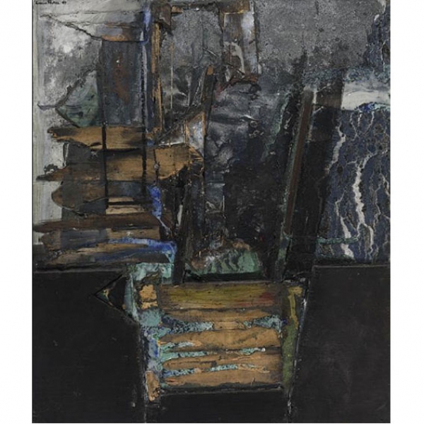 Frente cubierto por listones de madera, raspaduras y resinas. Alguna zona de acabado granulado. Firmado y fechado.