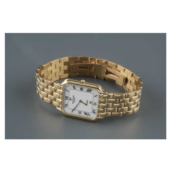 Esfera blanca, numeración romana, agujas tipo bastón y ventana calendario a las 6h. Movimiento de cuarzo. Brazalete integrado realizado en oro. Nº275330.