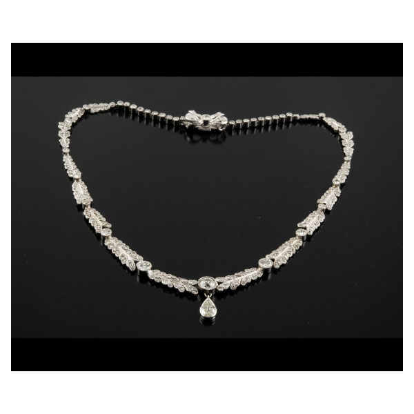 Realizada en oro blanco, representando una guirnalda con diamante central talla brillante antigua, peso aproximado: 1.75 ct. del que pende un diamante talla perilla antigua, peso aproximado:1.10 ct. y cierre en forma de lazada, todo cuajado de diamantes tallas brillante, brillante antigua y 8/8.
