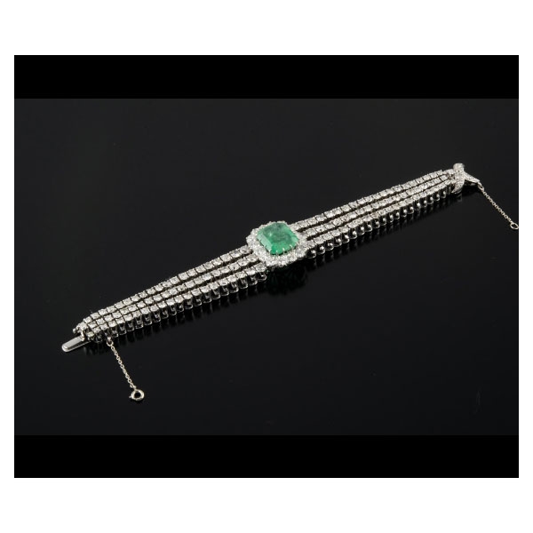 Realizada en oro blanco, compuesta por tres bandas y orla central de diamantes tallas brillante, brillante antigua y 8/8 dispuestos en disminución, peso total aproximado: 16.17 ct. y esmeralda talla esmeralda, peso aproximado: 8.07 ct.