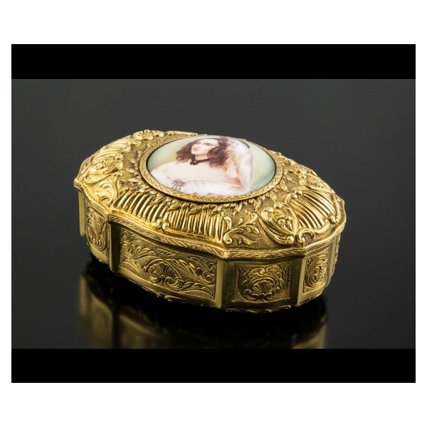 Realizada en oro, contorno polilobulado decorado con motivos vegetales, veneras y palmetas. Camafeo central de porcelana pintada a mano representando una dama con tocado de plumas.