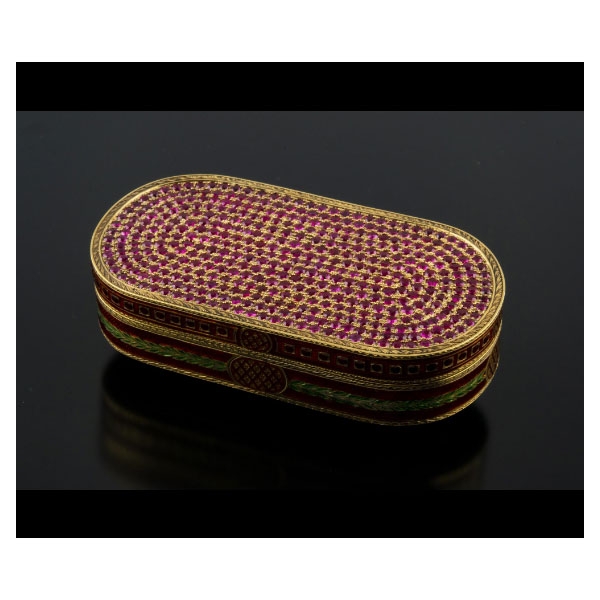 Realizada en oro grabado, de forma oval, con tapa cuajada por rubíes talla redonda, peso total aproximado: 50.52 ct. y esmaltada en colores rojo y verde, con motivos geométricos y grecas de laurel.