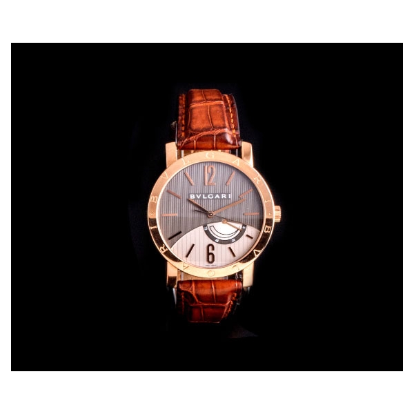 Realizado en oro rosa para caballero. Caja redonda, bisel grabado “BVLGARI”. Funciones: horarias, minuteras, segunderas y reserva de marcha. Numeración mixta: arábiga y baquetonada., agujas tipo bastón.