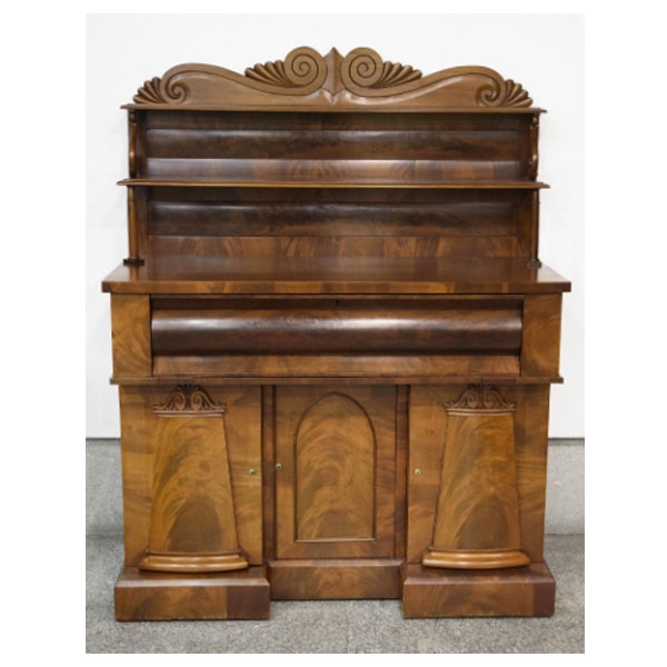 De tres cuerpos, el inferior de tres puertas con cajones y baldas al interior, intermedio de bureau con tapa abatible y perfil ondulado y superior retranqueado de baldas con remate tallado.