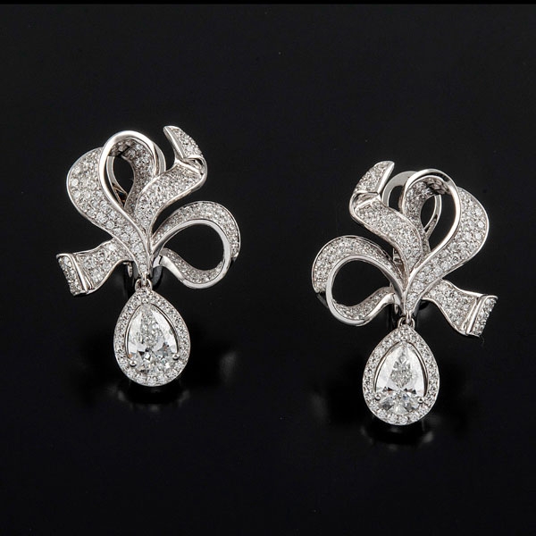 Pendientes largos formados por dos lazadas cuajadas de diamantes talla brillante, de las que penden 2 diamantes talla perilla, peso total aproximado de todos los diamantes: 2.25 ct.