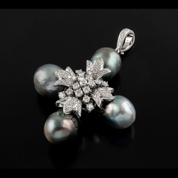 Realizada en oro blanco, parte central compuesta por un cuajado de diamantes talla brillante, peso total aproximado: 3.51 ct., rematada en cuatro perlas de Tahití calibradas entre 14.5 y 16 mm.