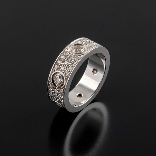 Realizada en oro blanco, alianza completa compuesta por un pavé de diamantes talla brillante, peso total aproximado: 0.36 ct. acompañados por seis diamantes intercalados talla brillante, peso total aproximado: 0.60 ct. Nº FMC172.