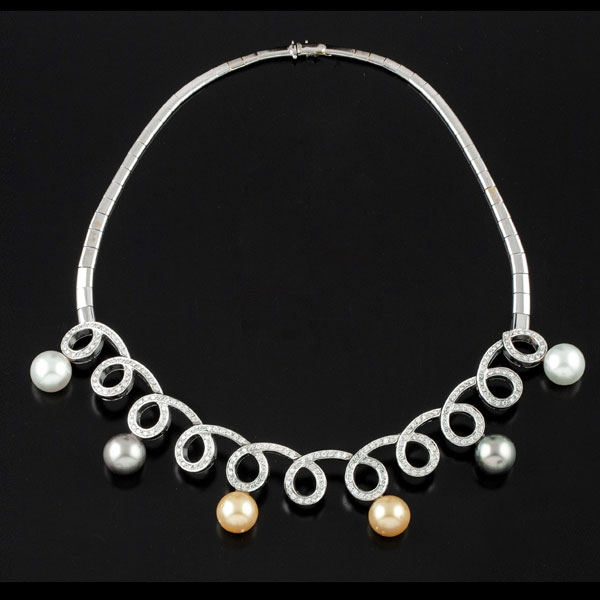 Realizada en oro blanco, con motivos centrales en forma de espirales cuajadas por diamantes talla brillante, peso total aproximado: 4.5 ct.,