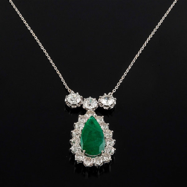 Realizado en oro blanco, con tres diamantes centrales, peso total aproximado: 1.50 ct., de los cuales pende una esmeralda central talla perilla montada en garras, peso total aproximado: 3.24 ct.,
