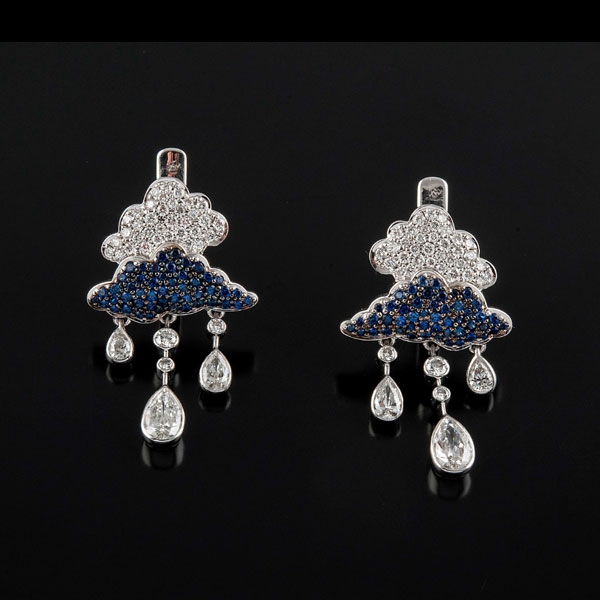 Pendientes largos realizados en oro blanco, en forma de nubes compuestas por diamantes talla brillante y zafiros talla redonda, de las que penden diamantes tallas brillante y perilla.