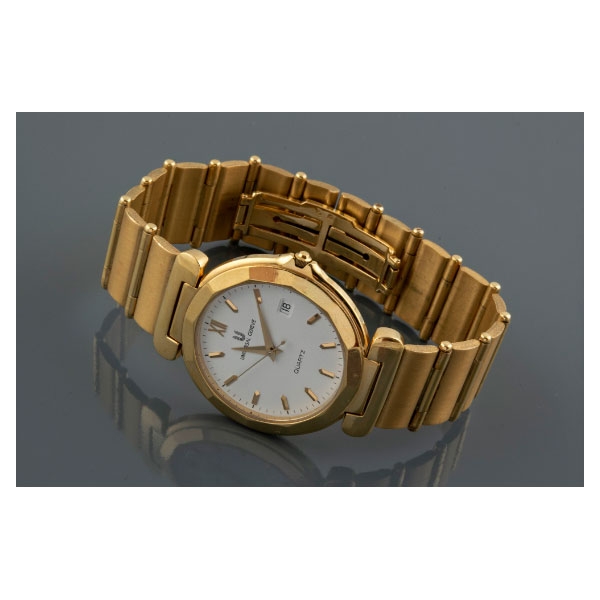 Realizado en oro para caballero. Caja redonda, bisel liso facetado. Funciones: horarias, minuteras, segunderas y calendario. Esfera blanca, agujas tipo dauphine, numeración mixta: baquetonada y romana, ventana para calendario a las 3 h.