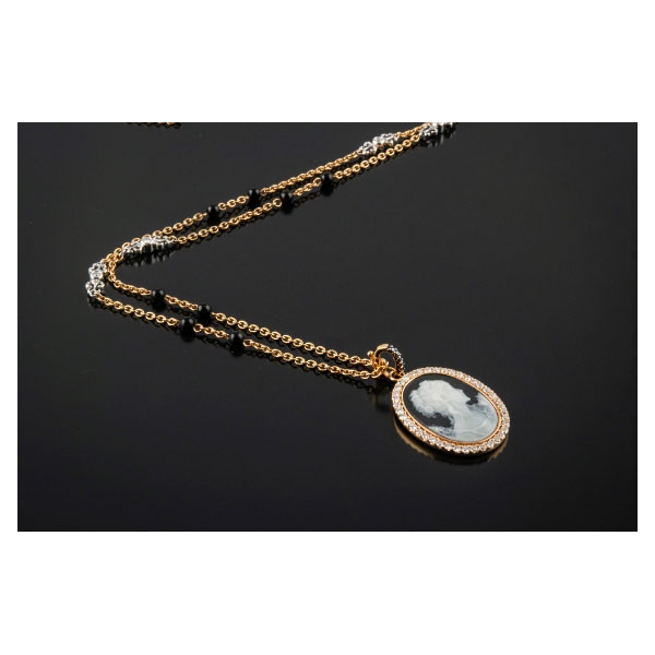 Se acompaña de cadena realizada en oro rosa y oro blanco, con cuentas de ónix y diamantes intercalados.