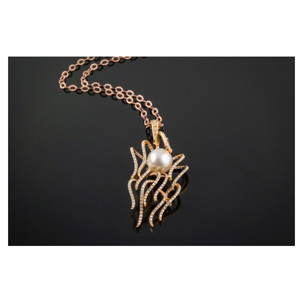 Realizado en oro rosa, en forma de casaca compuesto por diamantes talla brillante, peso total aproximado: 1.59 ct. acompañados por una perla australiana calibrada en 12 mm.