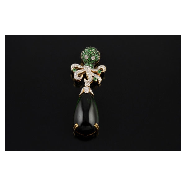 Realizado en oro, con la parte superior representando un pulpo, cuajado por granates tsavoritas talla redonda y diamantes talla brillante, peso total aproximado: 0.33 ct. y turmalina talla cabujón aperillada.