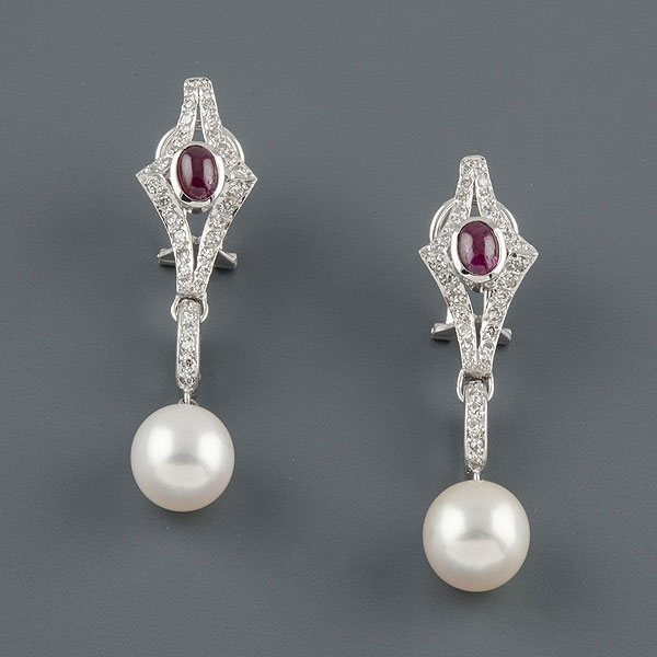 Realizados en oro blanco, formados por diamantes talla brillante, rubíes ovales talla cabujón, peso total aproximado: 2 ct., rematados por dos perlas cultivadas calibradas en 11 mm.