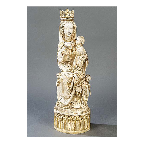 Sigue el modelo de la Virgen con Niño del Museo Lázaro Galdiano (número de inventario 2802). El Niño está de pie sobre las rodillas de su Madre que le ofrece una manzana. Ambos flanqueados por dos angelitos. Base con arcos entrelazados y tracerías góticas.