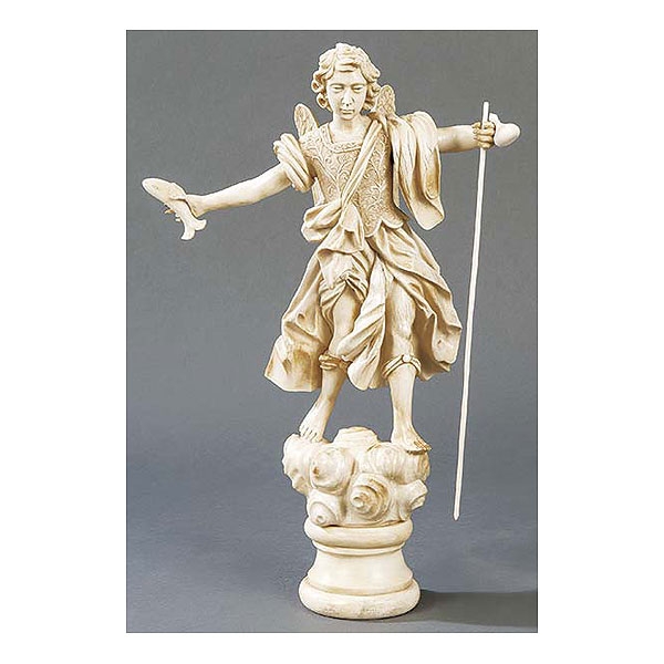 Con peana de nubes, porta un pez en la mano derecha y un bastón con calabaza de peregrino en la mano izquierda. Con fino corpiño tallado y pliegues movidos.