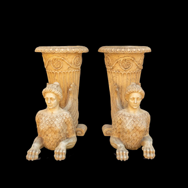 Pareja de cuernos de la abundancia apoyados sobre seres mitológicos hechos en fibra, años 70, siguiendo modelos romanos.