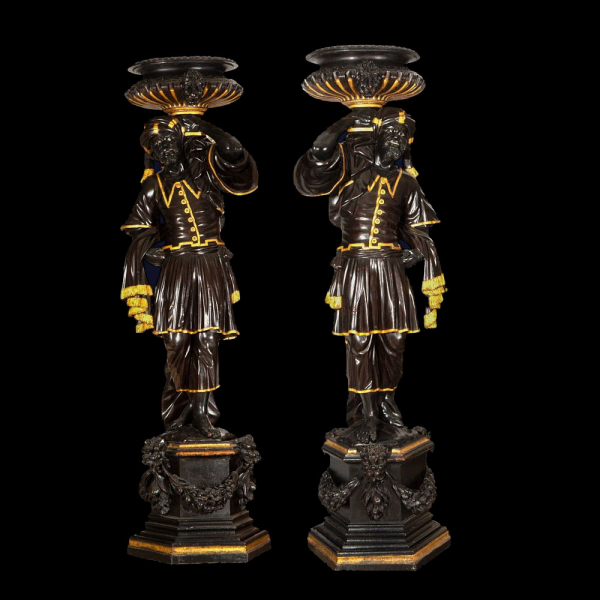 Dimensiones: 228 x 72 x 68 cm. Antorchero veneciano, esculpido con una gran riqueza de detalles en su vestimenta y expresión facial. Este tipo de esculturas servía no solo como elemento decorativo, sino también como símbolo del lujo y el poder en los grandes palacios venecianos del siglo XIX. Los detalles dorados reflejan la influencia del estilo barroco, mientras que la figura adopta una postura dinámica y teatral, propia del estilo rococó tardío.