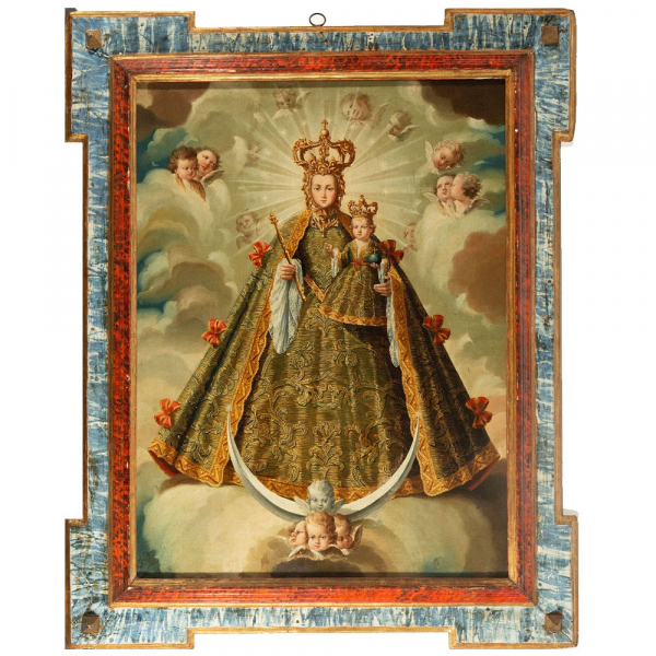 De vivos y ricos colores, la Virgen y el Niño Dios destacan en el centro del conjunto por sus exquisitos ropajes en seda verde bordada con hilo de oro y sus coronas, mientras miran al espectador, bajo los pies de la Madre de Dios, una media Luna de plata sostenida por tres ángeles, símbolo de María, y, rodeando el conjunto diez ángeles asoman su cabeza desde las nubes para adorarla.