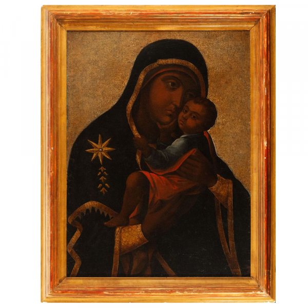 Virgen Negra (siguiendo modelos de Iconos Ortodoxos llegados de Europa del Este al Nuevo Mundo), trabajo Colonial o Virreinal del siglo XVII, posiblemente México o Perú.