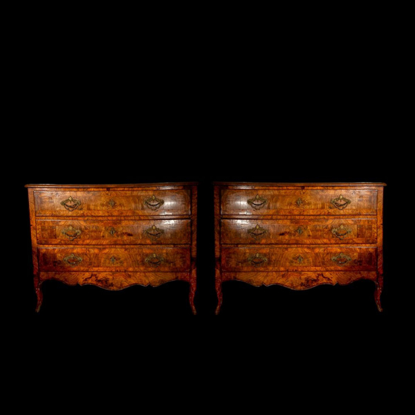 Dimensiones: 106 × 130 × 76 cm. Pareja de cómodas italianas del siglo XVIII, de líneas sinuosas decoradas con marquetería geométrica, que resalta el veteado del nogal. Con tres amplios cajones adornados con manerales de bronce en motivos florales, las cómodas evocan la elegancia del estilo Luis XV. Estas piezas son ejemplos de la refinada ebanistería italiana, reflejando el lujo y la sofisticación de los interiores aristocráticos de la época.