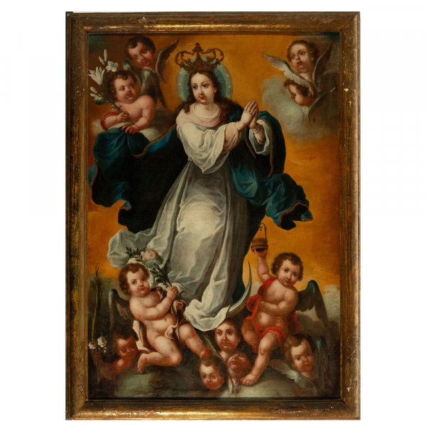 Importante Gran Virgen Inmaculada Rodeada de Ángeles Novohispana, trabajo colonial mexicano de finales del siglo XVII.