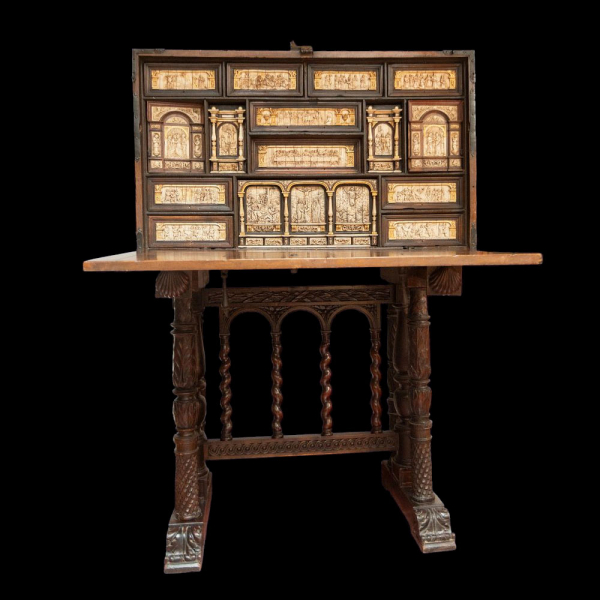 Único y excepcional Bargueño de caja prismática apaisada de planta rectangular y tapa frontal abatible con interior estructurado en tres registros. El registro superior presenta cuatro gavetas apaisadas iguales; el mediano dos gavetas apaisadas en el centro, dispuestas una sobre otra, a cada lado una gaveta vertical en cada extremo una portezuela con cerradura; el registro inferior lleva en el centro una, aplicadas y tallada con relieves de carácter litúrgico, la gran mayoría alusivos a la vida de Cristo. Se apoya sobre pie de puente de tres arcos con decoración tallada y alargaderos rematados.