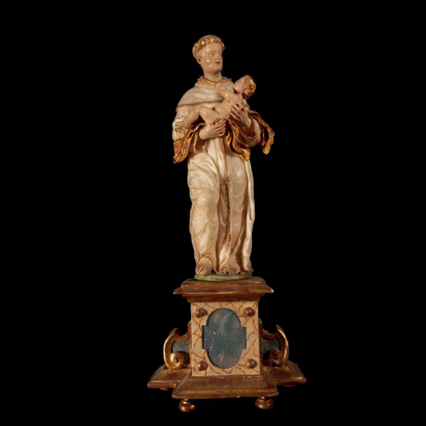 La escultura de mármol muestra a San Antonio sosteniendo tiernamente al Niño Jesús, quien descansa en sus brazos con una expresión serena. Los detalles finos en los pliegues de la vestimenta y la suavidad de las expresiones faciales son testimonio de la maestría escultórica napolitana. Durante el siglo XVII, este tipo de representaciones fue popular, sobre todo en Nápoles, por su realismo y devoción.