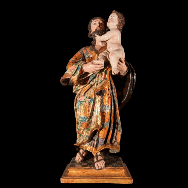 Importante y Grande San José con niño, siglo XVII, escuela colonial Mexicana de Puebla.