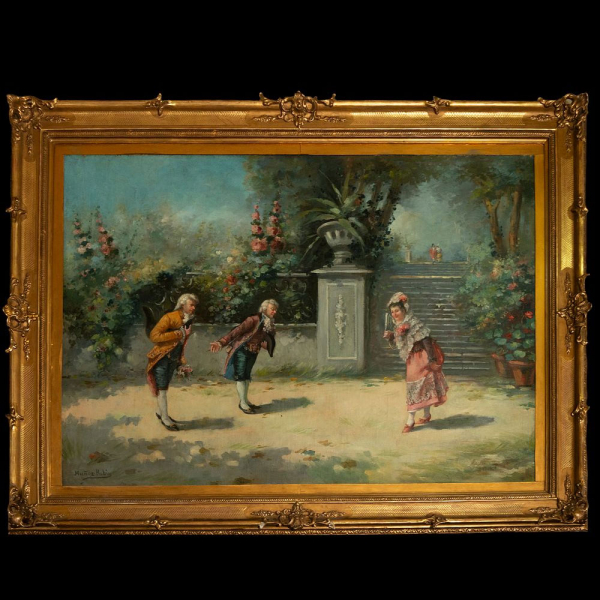 La Proposición - Importante y Grande Óleo sobre lienzo firmado Muñoz Rubio ángulo inferior izquierdo, escuela Romántica española del siglo XIX.
