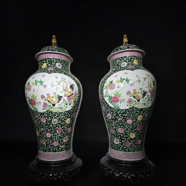 Par de Jarrones de Porcelana Estilo Famille Verte, Francia, Siglo XIX.