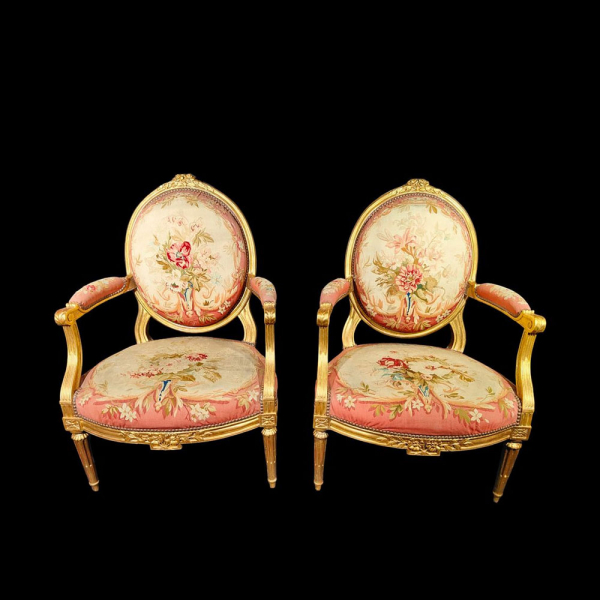 Ambas tapizados en tapicería original de Beauvais conservando un fuerte colorido original y tejidos con arbustos en flor sobre un fondo rojizo, cada uno con un respaldo ovalado, los apoyabrazos tapizados sobre soportes de balaustre esculpidos a juego y rematando a juego con hojas de acantola baranda del asiento con frontón tallado a juego, sobre patas acanaladas torneadas cónicas.