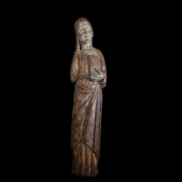 Medidas: 160 x 38 x 25, en madera de pino negro de los Pirineos “Pinus Uncinata”, buen estado de conservación en madera sin ni siquiera apreciarse restos de xilófagos, y conservando buena parte de su policromía original en ropajes y rostro. Procedencia: ex-colección particular madrileña, importante colección particular, España.
