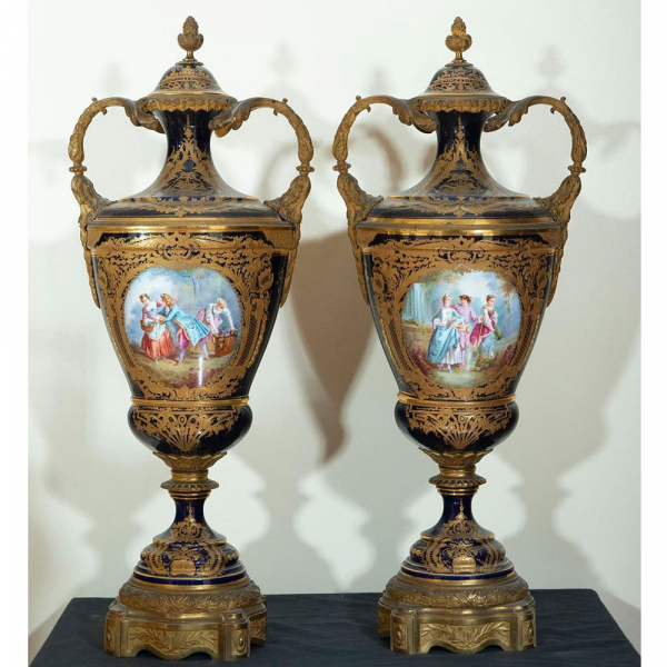 Elegante Gran Pareja de Jarrones en porcelana de Sèvres "Bleu Royale" pintados y esmaltados a mano, trabajo francés del siglo XIX.