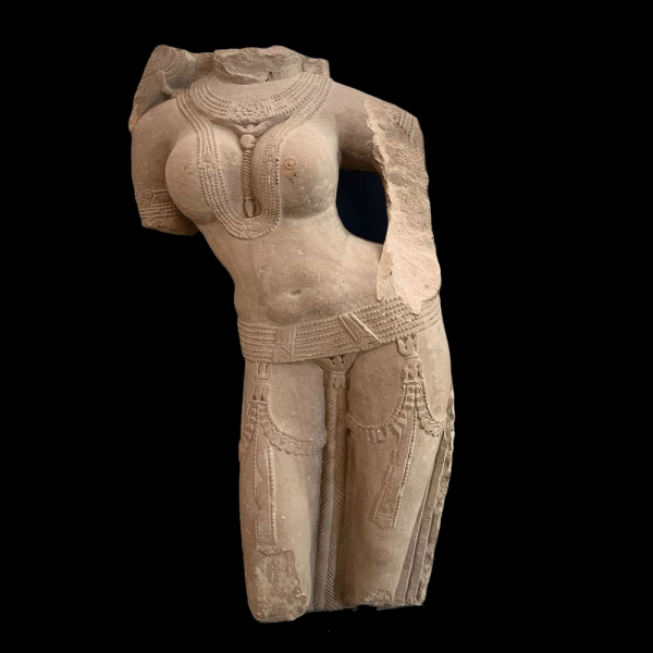 En piedra natural. Buen estado de conservación, con peana en acero. Medidas: 95 x 30 cm. Obra muy similar a la conservada en el Museo Guimet, París. Bibliografía de referencia: Pratapaditya Pal, Boletín del Instituto de Asia, nueva serie Vol. 21 (2007), pp. 25-33 (Evidence of Jainism in Afghanistan and Kashmir in Ancient Times, Pratapaditya Pal, Bulletin of the Asia Institute, New Series, Vol. 21 (2007), pp. 25-33)]. Procedencia: propiedad de una importante colección particular europea.