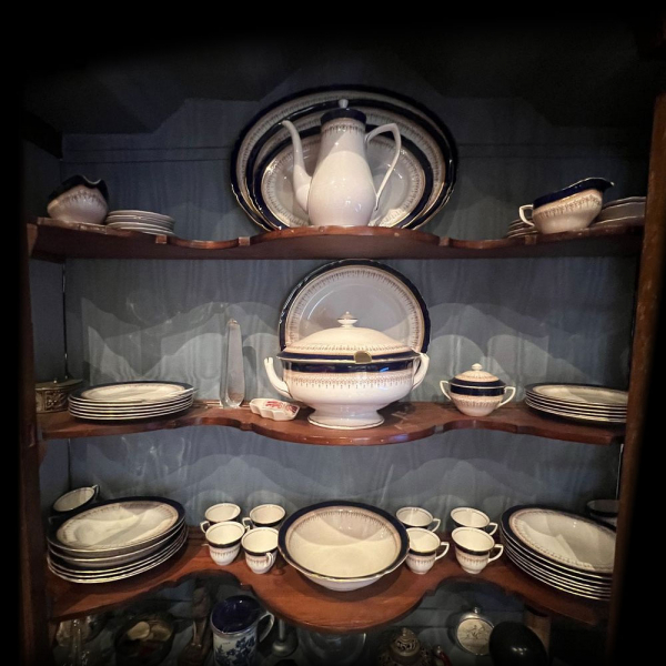 Completa. 12 bajoplatos, 12 platos, sopera, ensaladera, juego de café completo y tres bandejas de pescado.